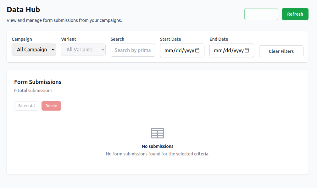 The Data Hub in VibeFunnel is a powerful tool designed to help you view and manage form submissions collected from your campaigns. This section is dedicated exclusively to VibeFunnel forms, meaning it does not handle submissions from integrations like HubSpot (those are managed directly within their respective platforms). Use the Data Hub to track and organize data efficiently from your custom VibeFunnel forms.
