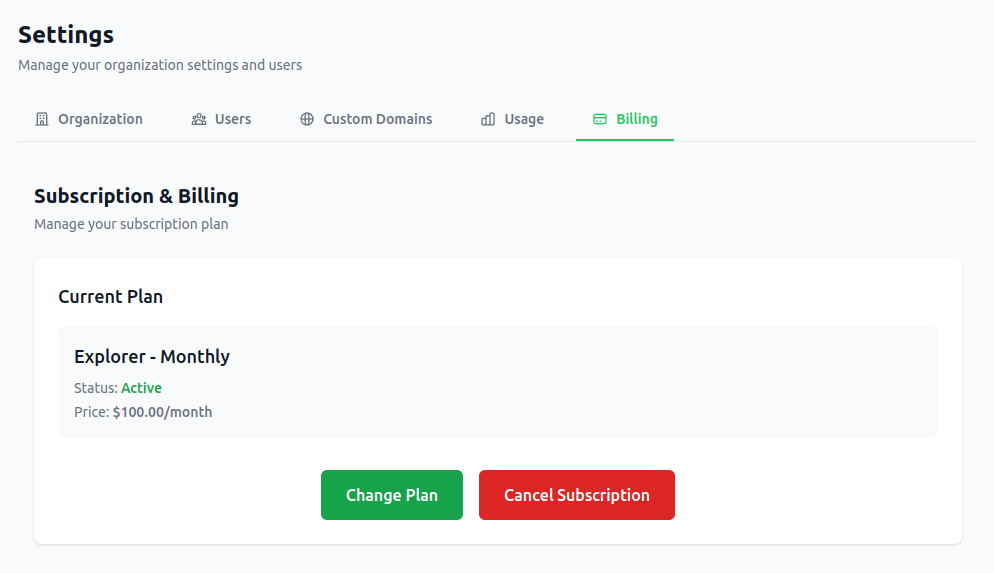The Subscription & Billing section in VibeFunnel allows you to manage your subscription plan effectively, ensuring it aligns with your organization’s needs. This guide covers how to view your current plan, change it, or cancel it, with key details on the process.
